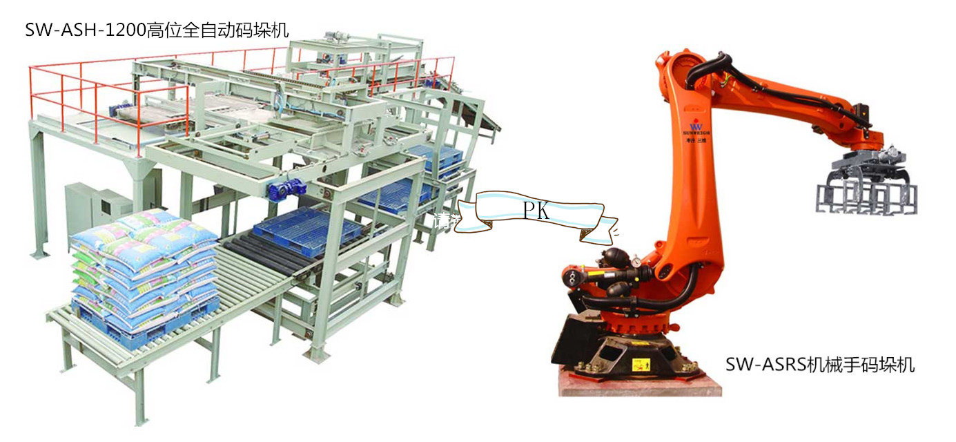 機(jī)械手碼垛機(jī)眾所周知有如人手一般的裝置,棗莊三維機(jī)械手碼垛機(jī)SW-ASRS主要由壓平整理、緩沖輸送機(jī)、抓取輥道、托盤機(jī)、機(jī)械手等裝置組成。整個(gè)碼垛的過(guò)程首先由輸送機(jī)將合格的包裝袋輸送到整平機(jī)進(jìn)行壓袋整平,使袋形平整,包裝袋到達(dá)抓取輥道后機(jī)械手檢測(cè)到來(lái)袋的包裝袋對(duì)其進(jìn)行抓取、轉(zhuǎn)向、堆放、分層進(jìn)行碼放,從而完成整個(gè)碼垛工序。而它像人手一般的機(jī)械手裝置有一個(gè)缺點(diǎn),如果來(lái)袋的包裝袋袋型不夠整齊會(huì)導(dǎo)致抓袋時(shí)將包裝袋抓破。因?yàn)闄C(jī)械手結(jié)構(gòu)簡(jiǎn)單安裝方便前期投入少、可同時(shí)碼垛不同規(guī)格型號(hào)的來(lái)料成品,也滿足3條輸送線來(lái)料的碼垛需求的特點(diǎn),所以上市以來(lái)倍受眾多客戶的青睞。而棗莊三維不但有機(jī)械手這個(gè)結(jié)構(gòu)小巧安裝簡(jiǎn)單的碼垛機(jī)外,還有一款不會(huì)將包裝袋抓破的全自動(dòng)碼垛機(jī)SW-ASH-1200高位全自動(dòng)碼垛機(jī),顧名思義高位碼垛機(jī)安裝高度相對(duì)機(jī)械手碼垛機(jī)來(lái)說(shuō)要高出許多,而且高位全自動(dòng)碼垛機(jī)只能碼垛一種規(guī)格一條輸送線來(lái)料的成品碼垛需求,而且相對(duì)機(jī)械手而言前期投入成本多出接近10倍,所以客戶一般都很少關(guān)注。但是高位碼垛機(jī)碼垛速度能達(dá)到1600包/小時(shí),垛型整齊美觀牢固,是較傳統(tǒng)的人工碼垛效率高,這是機(jī)械手無(wú)法比擬的,而且所有包裝袋的袋口朝里,可實(shí)現(xiàn)自動(dòng)編組分層。而機(jī)械手一般可碼垛800包/小時(shí),雙手的可達(dá)到1000包/小時(shí)的碼垛速度;一般的機(jī)械手碼垛機(jī)可用6-8年,而高位全自動(dòng)碼垛機(jī)可使用100年,使用壽命高出12倍還多;高位碼垛機(jī)可在任何地區(qū)使用,而機(jī)械手碼垛機(jī)不能在高原地區(qū)使用,多用于北方地區(qū);機(jī)械手碼垛機(jī)每年會(huì)產(chǎn)生1-3W的保養(yǎng)維護(hù)費(fèi),而這項(xiàng)費(fèi)用高位碼垛機(jī)沒(méi)有,長(zhǎng)期以往節(jié)省不少開(kāi)支。