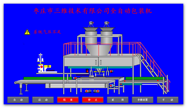 如出現(xiàn)圖中報(bào)警信息時(shí),在處理完報(bào)警內(nèi)容并且沒有報(bào)警信息后,點(diǎn)擊“自動(dòng)”按鈕,或外部旋鈕選擇,此時(shí)“自動(dòng)”按鈕顯示為亮綠色,提示切換完成,按儀表啟動(dòng)按鈕,啟動(dòng)稱料系統(tǒng),點(diǎn)擊屏幕或外部“啟動(dòng)”按鈕,設(shè)備啟動(dòng)時(shí)首先經(jīng)過6秒左右的初始化,報(bào)警燈伴隨聲光報(bào)警,提示相關(guān)人員設(shè)備啟動(dòng),套袋擺臂執(zhí)行一個(gè)抬起落下動(dòng)作,以回到準(zhǔn)備位置,抱袋小車如不在準(zhǔn)備位置則回到準(zhǔn)備位置。初始化完成后,屏幕上啟動(dòng)按鈕亮起,設(shè)備進(jìn)入正常工作狀態(tài)。