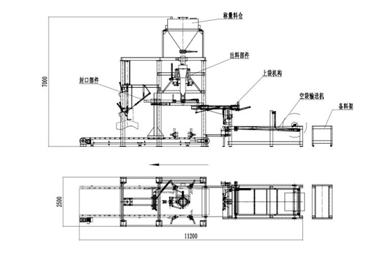 全自動機器上袋氧化鋁噸袋包裝機主要機構(gòu):氧化鋁空袋輸送機構(gòu)、自動上袋機構(gòu)、氧化鋁自動稱量機構(gòu)、氧化鋁自動灌裝機構(gòu)、自動熱合封口、自動噴碼打印、氧化鋁自動輸送機構(gòu)。簡略圖紙如下: